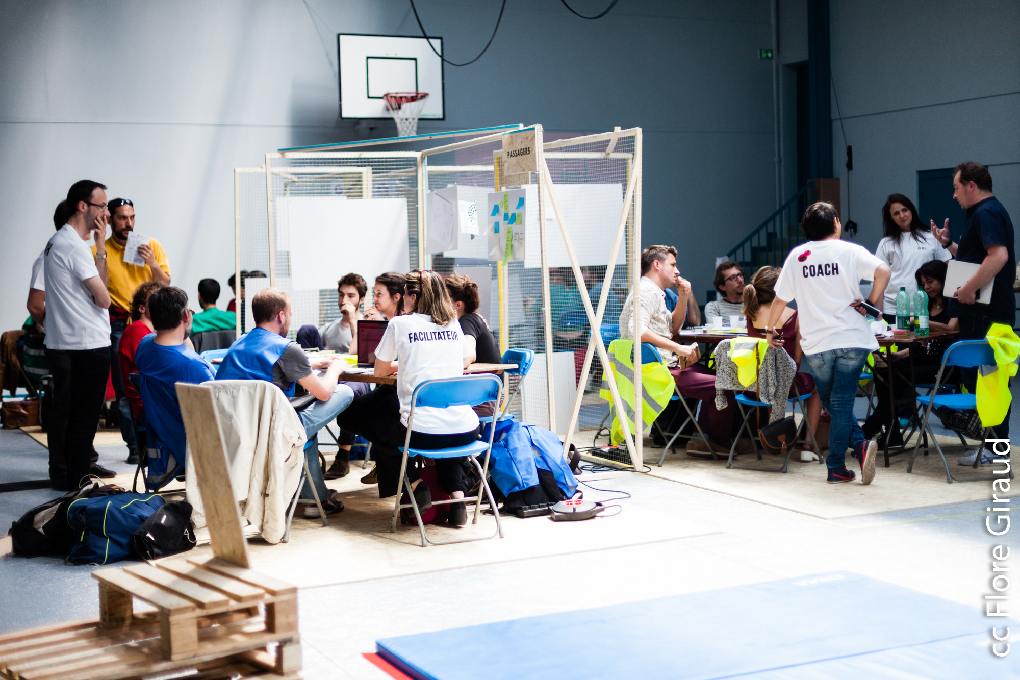 Leur mission : faire travailler ensemble 150 personnes pendant 3 jours, par équipes de 7 compétences, en favorisant la rencontre, la proximité avec les ateliers ressources présents sur place, fablabs, coachs, techshop, espace de restauration et plateformes de construction, de communication.