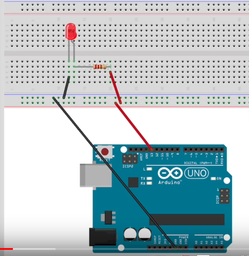 Vous utiliserez la pin digitale 13 de votre carte Arduino, reliée au fil rouge. Placez sur la breadboard une résistance de 220 Ohms et la led dans le bon sens (la petite patte dit être reliée au MOINS, fil noir).