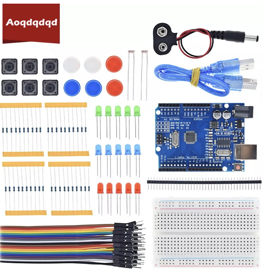 – Acheter un matériel minimal : une carte Arduino reconnaissable dans le kit ci-dessous, un câble USB A-B (au dessus de la carte), une BreadBoard (en bas à droite), des câbles de prototypage (en bas à gauche). Pour pouvoir faire quelque chose, il faut également une alimentation électrique (en haut à droite), des capteurs, des actionneurs (leds ou autres) et quelques composants électroniques (résistances, etc.).