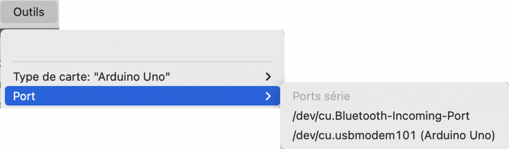 -> Indiquez à l’IDE Arduino sur quelle prise de votre ordi vous avez branché votre carte. Lancez Arduino et Menu Outils > Port > USB… (le choix dépend de votre ordi)