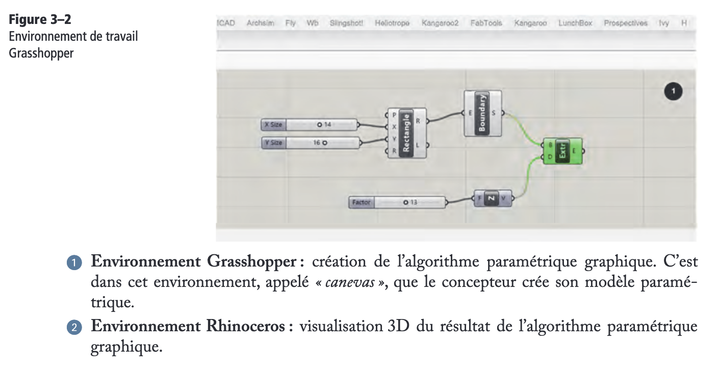 Grasshopper est un éditeur d’algorithmes visuels, un espace d’écriture conçu pour être utilisé avec Rhino. La géométrie est visualisée dans rhino .