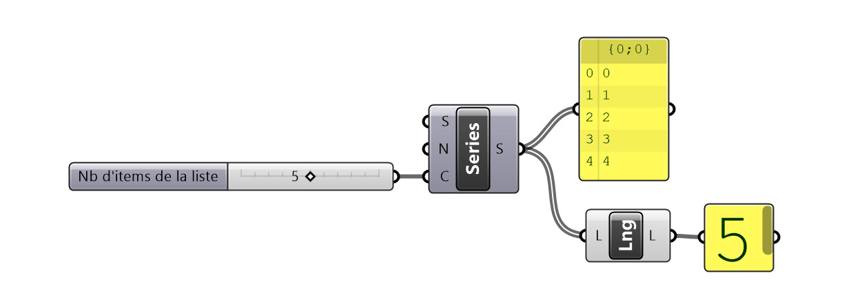Le composant List Length permet d’obtenir le nombre d’items d’une liste. L’indice du dernier item d’une liste de N, dont aucun item n’a été supprimé à l’aide de composant CULL par exemple, est N-1. Ainsi dans l’exemple ci-dessous, la liste est constituée de 5 items dont l’indice du dernier est 4.