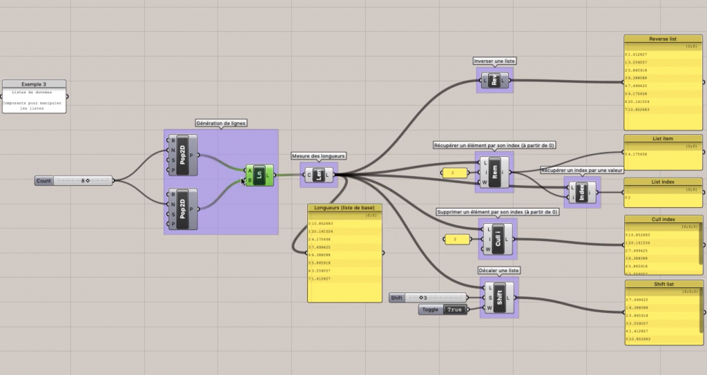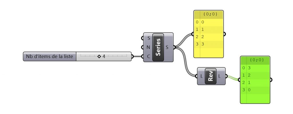 Une liste est un contenant stockant les informations créées dans gh que ce soit des géométries ou des données. Les listes dans gh possèdent un indice, sont ordonnées et débutent en 0 (le premier item d’une liste est donc l’item 0 – et non 1). Le dernier indice d’une liste constituée de n items est n-1 !