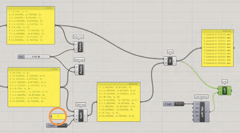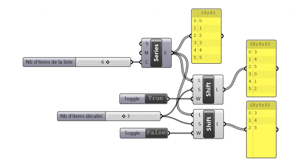 Dans cette section, nous abordons un outil de transformation qui affecte l’ordre et le nombre d’éléments d’une liste. Ainsi, le composant Sets>List>Shift List crée un décalage positif ou négatif d’un élément d’une liste avec une option de suppression sur sa troisième entrée (notée W pour wrap, monter ou descendre le rang d’un élément). Le nombre de pas de décalage est fixé sur sa deuxième entrée (notée S, comme Shift).