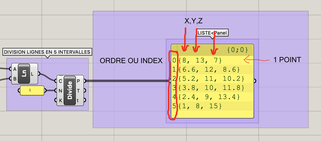 Les points sont aussi affichés au niveau de l’algorithme sous la forme d’une liste indexée visualisable en connectant la sortie P (intégrant les points) à l’entrée d’un composant Params>Input>Panel.
