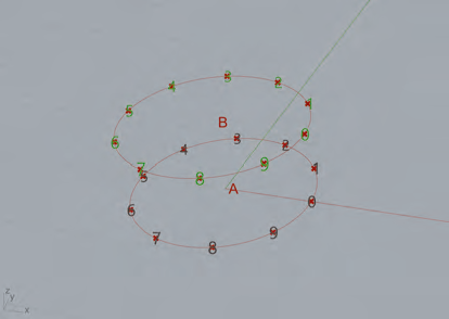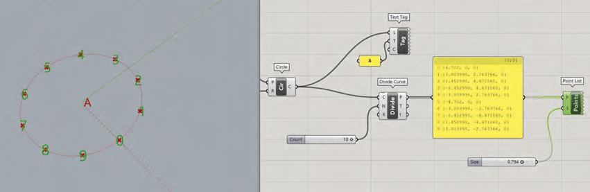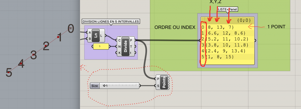 Par ailleurs, nous exploitons le composant Display>Vector>Point List pour marquer les points délimitant les tronçons. Son entrée P est connectée à la liste de points de division, et son entrée S à un composant Number Slider pour définir la taille d’affichage des indices des points.
