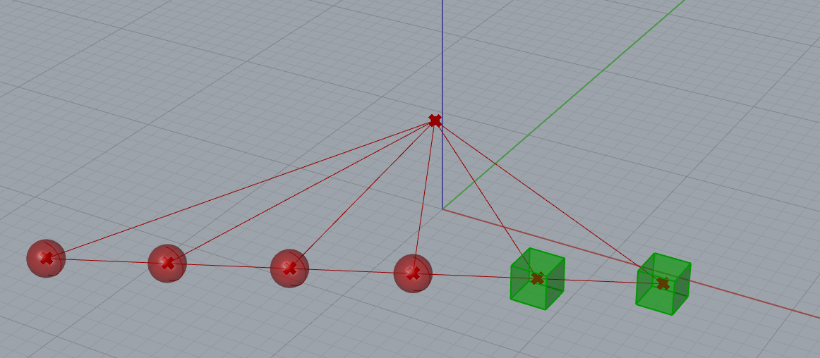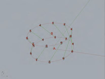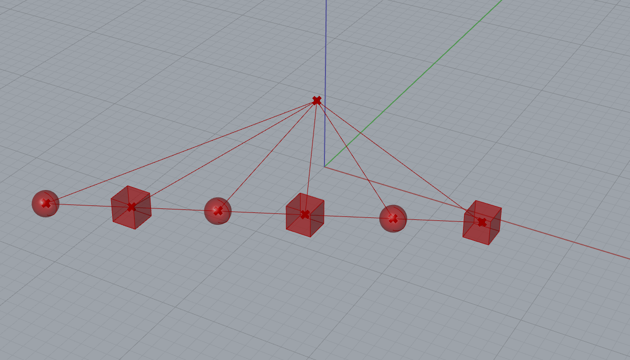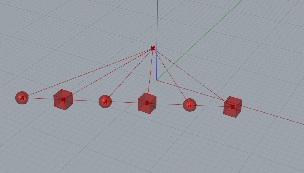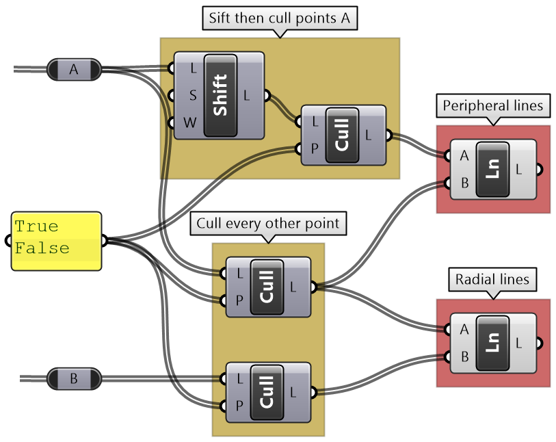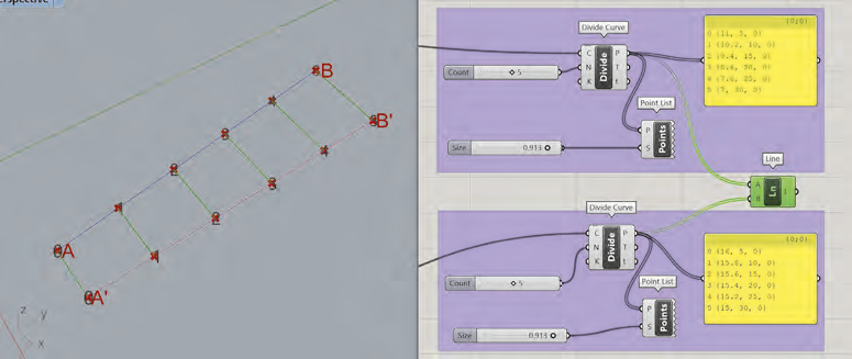 Reliez par des segments de droite deux listes intégrant un nombre de points différents. Nous utilisons le composant List Item pour extraire les points ayant les indices n° 0, 1, 2 et 3 de la liste A’B’. Les points sélectionnés sont ensuite reliés à l’ensemble (les 6 points) de la liste AB.
