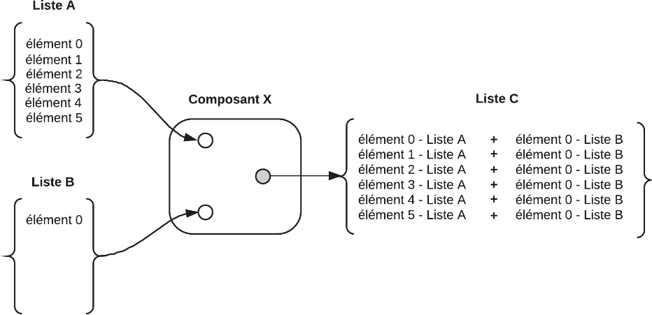 Les composants Grasshopper proposent différents modes de traitement des listes. Ces modes dépendent particulièrement du nombre d’éléments (géométriques ou autres) qui figurent dans les listes.