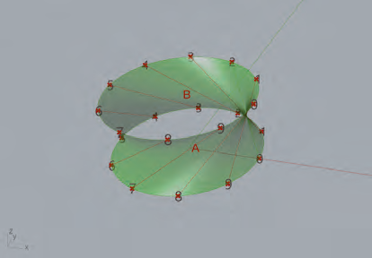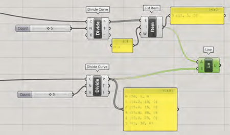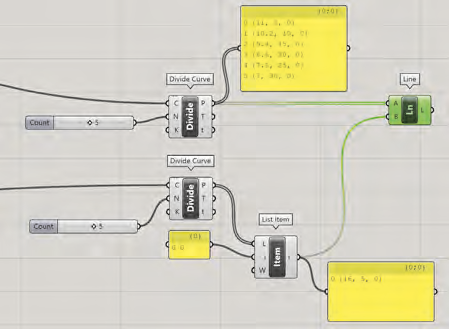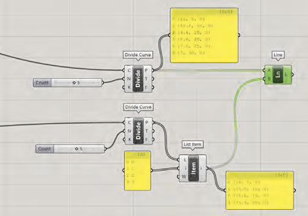 relié au composant Divide de chaque courbe et suivi du composant Lenght, le composant Cross Reference permet de relier chaque point d’une courbe à chaque point d’une autre courbe.