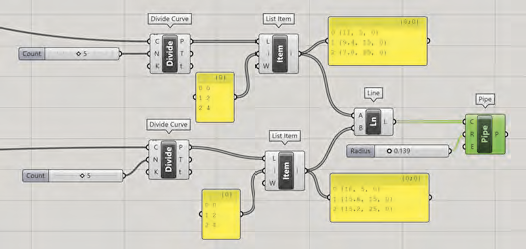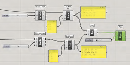 Celle-ci est plus grande que le banc paramétrique. Nous devons diviser les tuyaux et ne garder que la partie médiane. Nous pouvons utiliser Split with brep avec le composant Brep >Intersect > Région et diviser l’axe des tuyaux à l’aide de la forme de base du banc paramétrique que nous avons importé de Rhino sous forme de Brep. Ensuite, nous devons utiliser le composant List Item>Sets > List pour choisir les parties centrales et les transformer en tuyaux.