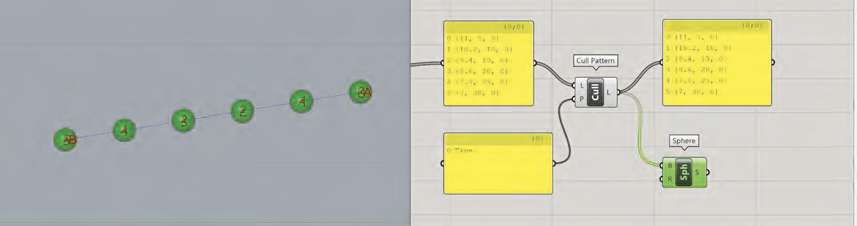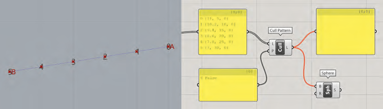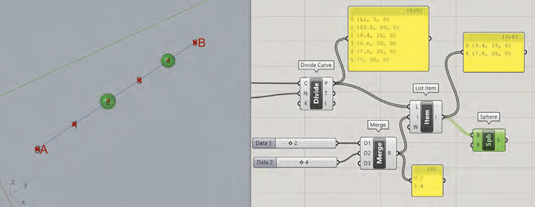 Pour obtenir les deux groupes de points, nous allons récupérer la dernière chaîne paramétrique réalisée et remplacer le composant Cull Pattern par le composant Dispatch. Il suffit ensuite de connecter la sortie A du composant Dispatch à l’entrée B du composant Sphere et la sortie B à l’entrée du composant Center Box