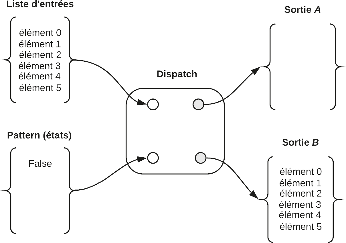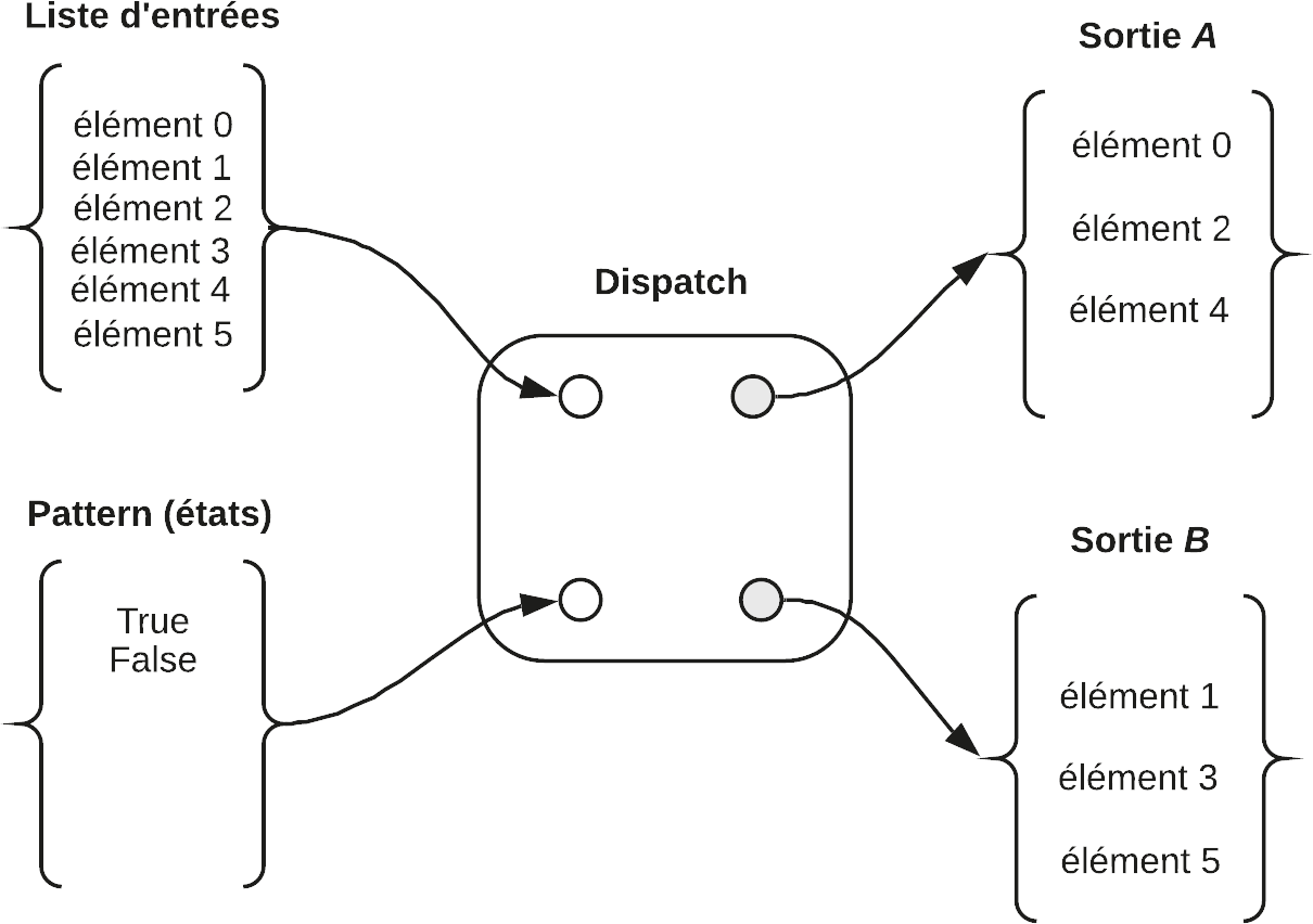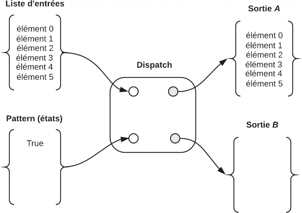 Si une alternance d’états True/False est appliquée aux éléments d’une liste d’entrées, l’état True est appliqué à l’élément 0 afin de le diriger vers la sortie A, et l’état False est appliqué à l’élément 1 pour le diriger vers la sortie B et ainsi de suite, jusqu’au dernier élément de la liste.