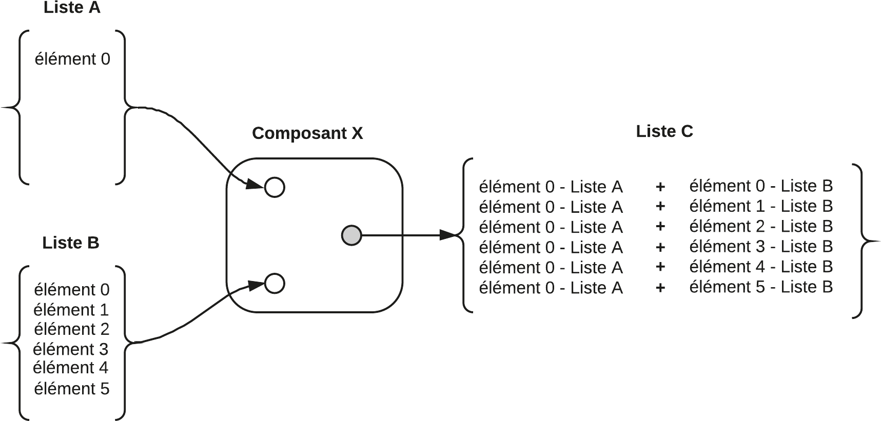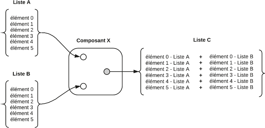 Le composant reliant ces deux listes reliera chaque élément de la liste A à l’élément correspondant (ayant le même ordre de classement) dans la liste B.