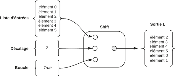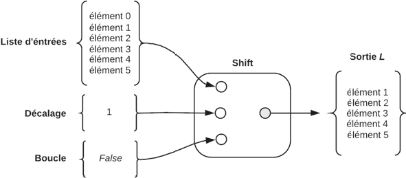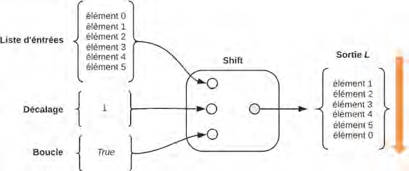 le composant Shift décale la liste de 1 vers le haut, ce qui permet de décaler l’élément 0 de rang 1 au rang 6 en gardant le même nombre total d’éléments.