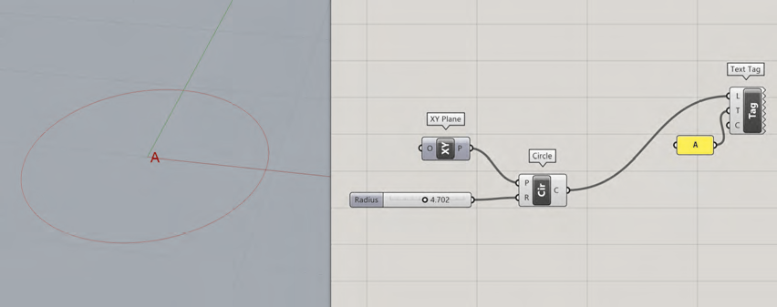 le repère cartésien local (nommé « plane ») facilitant le repérage des coordonnées des objets dans cette partie de l’espace. Cette sortie sera connectée à l’entrée P du composant Circle. Le rayon du cercle est défini par un Number Slider (variant de 0 à 10), connecté à l’entrée R du composant Circle. Pour nommer ce cercle, nous utilisons le composant Display>Dimensions>Text Tag connecté à un composant Panel et comportant la lettre A.