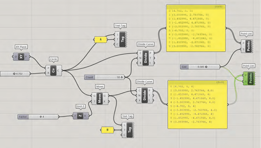 Nous dupliquons cette chaîne paramétrique pour créer un deuxième cercle portant les mêmes propriétés de division et d’affichage des sommets. Ce cercle sera déplacé de 4 unités dans la direction de l’axe Z en exploitant le composant Transform>Euclidean>Move dont l’entrée G