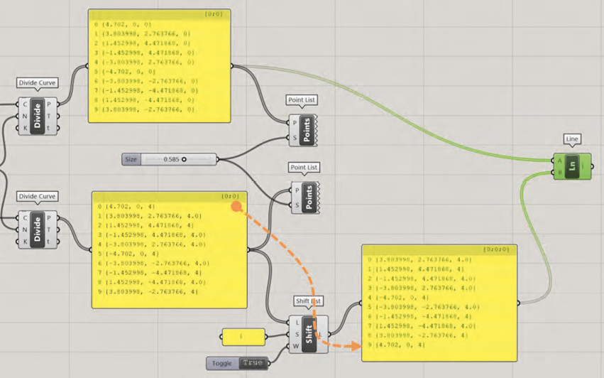 Dans le cas où le décalage est de -1 avec la fonction de boucle activée, le composant Shift décale la liste de 1 vers le bas, ce qui permet de décaler l’élément 0 de rang 1 au rang 2 en gardant le même nombre total de points.