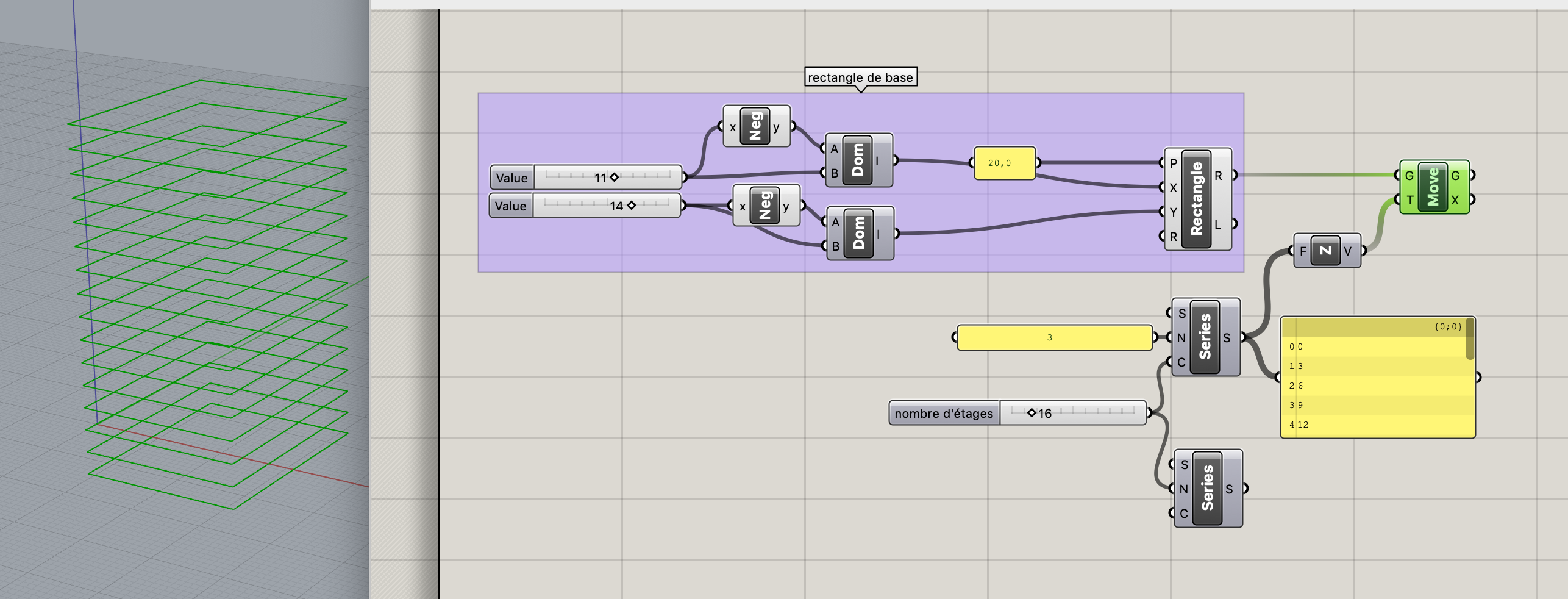 Dupliquer le rectangle sur l’axe Z en un nombre d’étages paramétrique Pour éviter l’utilisation répétée de l’outil move, on utilise les listes.