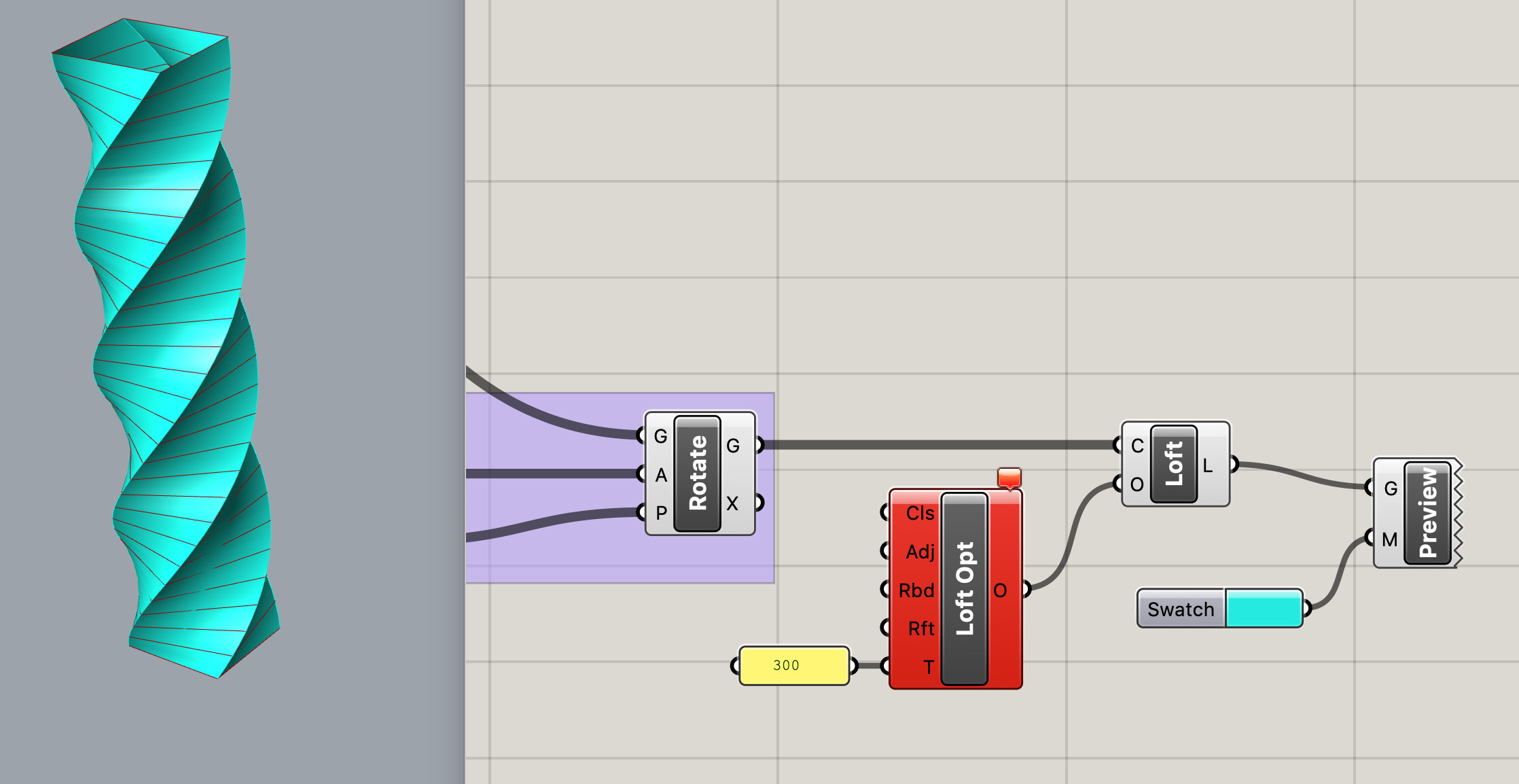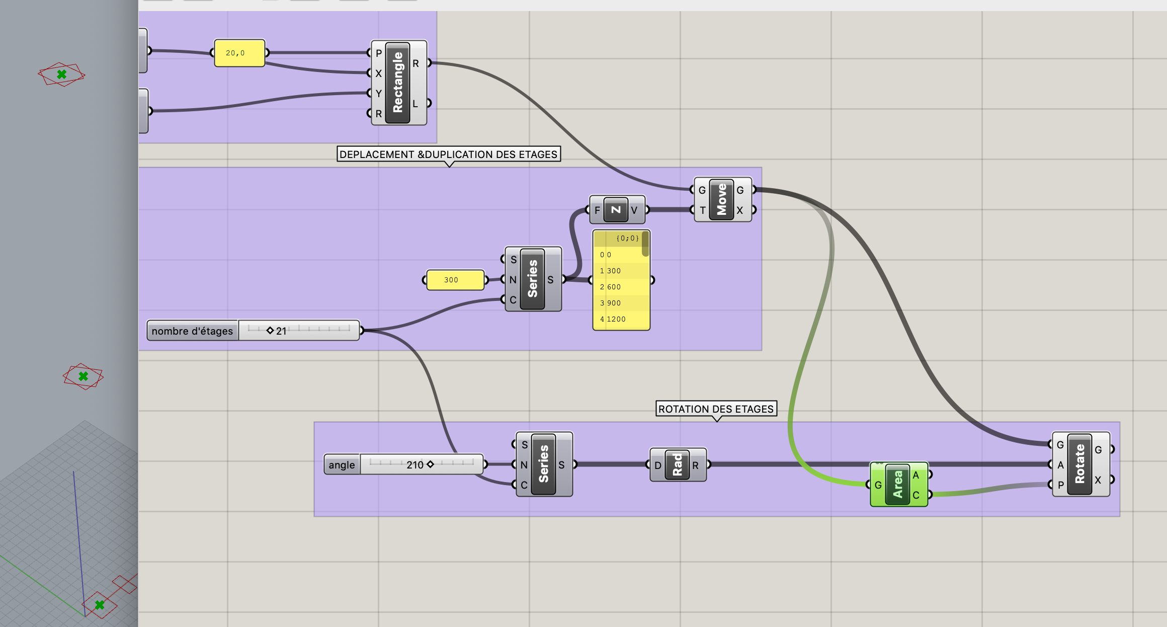Pour réaliser une rotation par le centre des plans d’étages, connectez le composant Surface>Analysis> M2 (AREA) à Move en G et Rotate en P.
