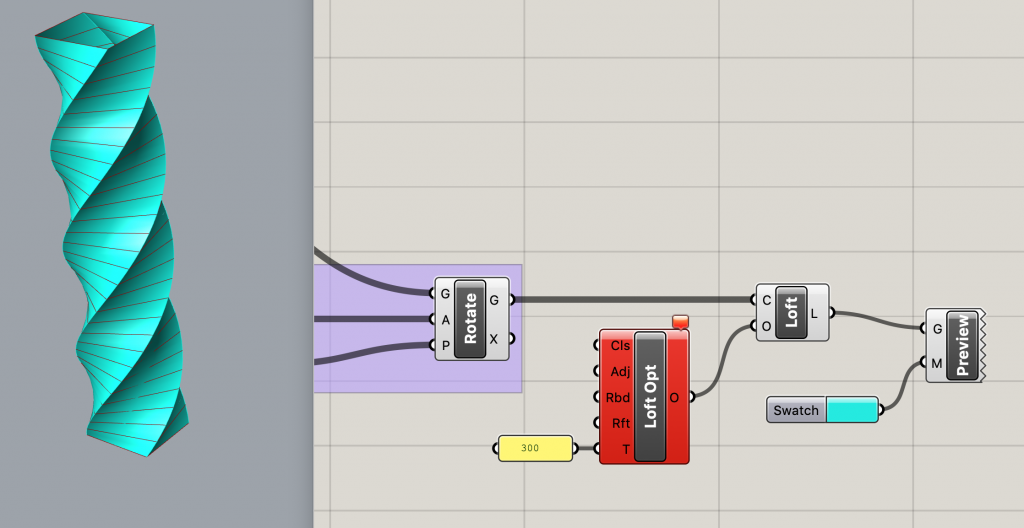 Pour définir la direction et les distances de déplacement du rectangle générateur, nous utilisons le composant Vector>Vector>Unit Z connecté à l’entrée T du composant Transform>Euclidean>Move.
