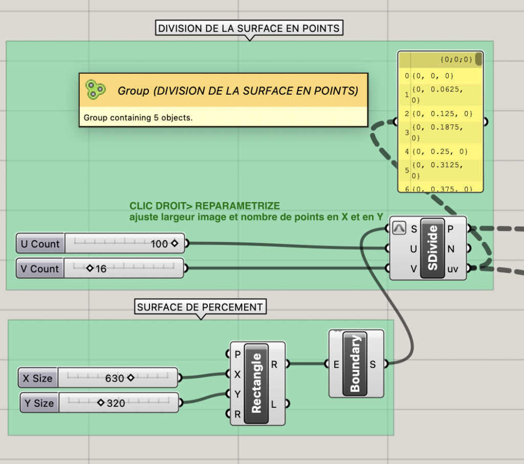 Clic droit sur S de SDivide>Reparametrize permet d’ajuster largeur image et nombre de points en X et Y). Quelle que soit la taille de la surface,les valeurs en U et V ne vont varier que de 0 à 1. Tous les points vont être répartis proportionnellement)
