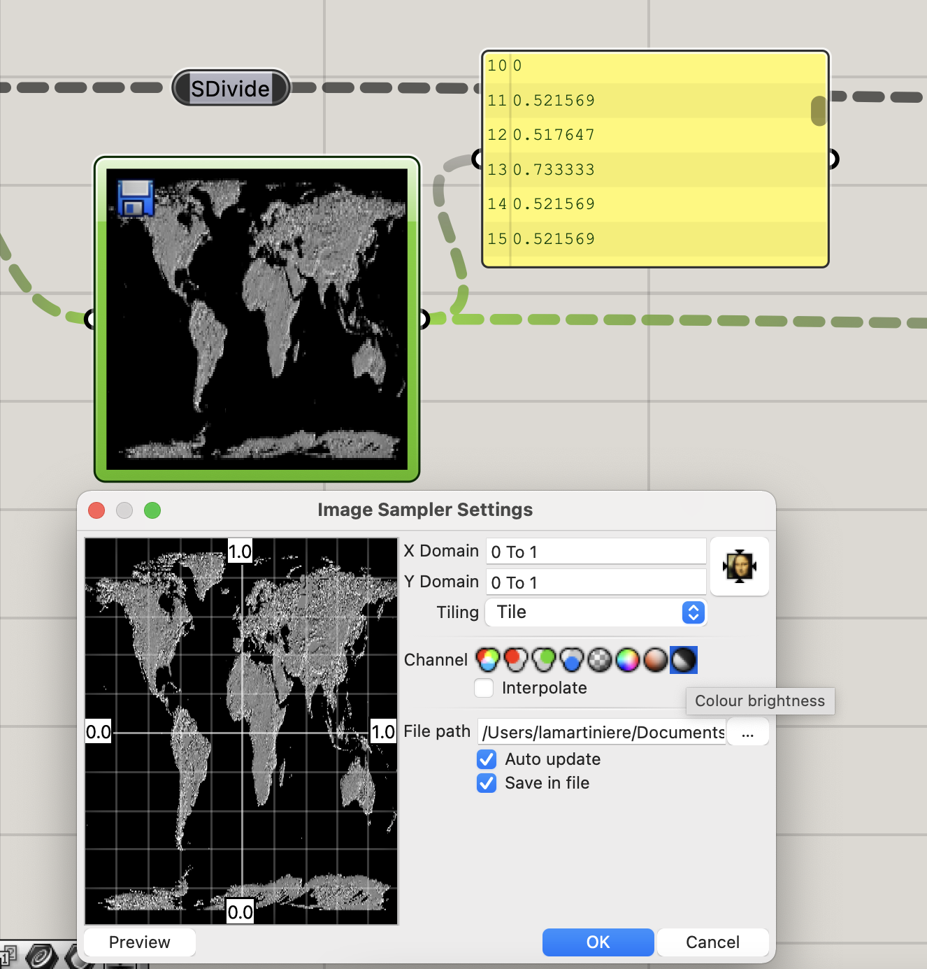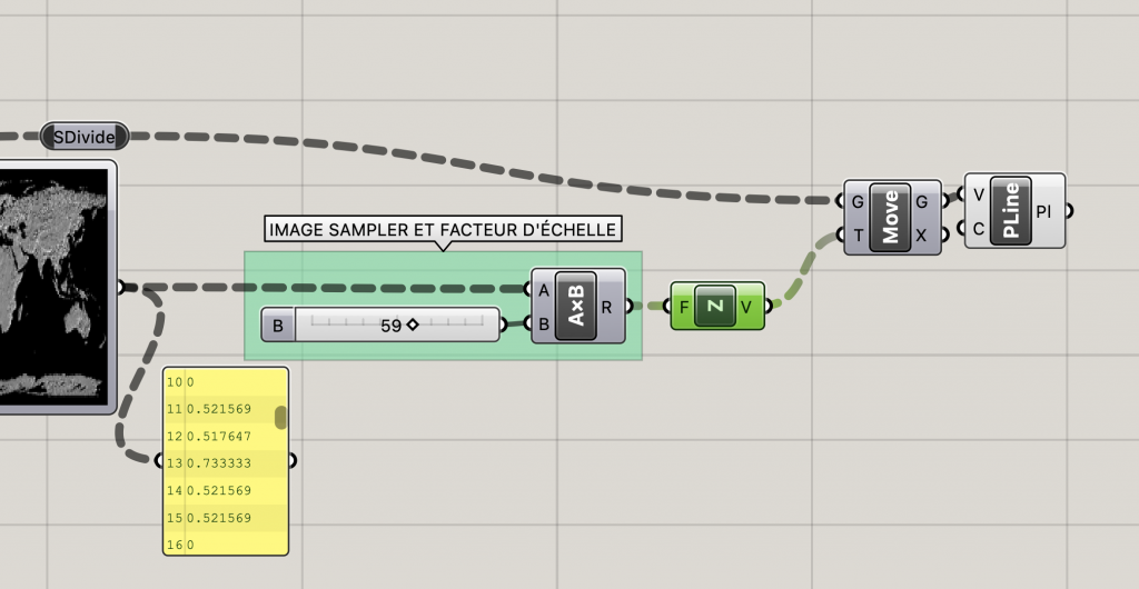 Une grille de points est créée aux dimensions de l’image et dont l’espacement des points est modulé en fonction de la densité de points de l’image échantillonnée souhaitée. Cette grille alimente le composant Image Sampler (Echantillonnage d’image) et permet de recueillir la valeur de la luminosité en chaque point.