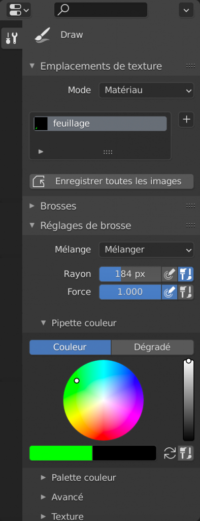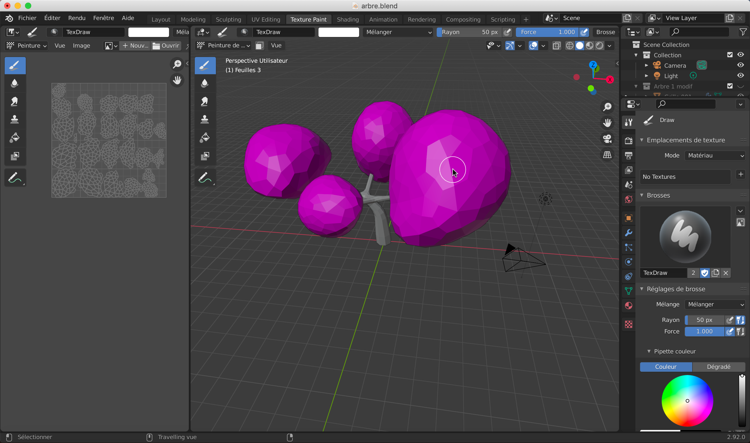Passer en Mode Peinture de Texture, en cliquant sur l’espace de travail « Texture Paint » en haut de l’écran. Vous verrez la configuration ci-dessous.