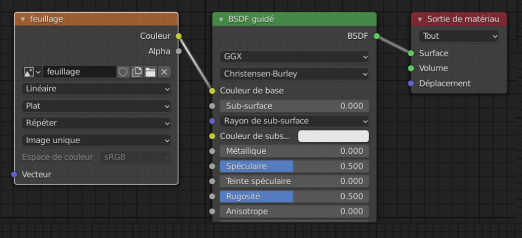 Un Node Shader BSDF par défaut apparait. Ajouter une Texture > Texture Image. Cliquer sur le dossier et choisir l’image feuillage.png.