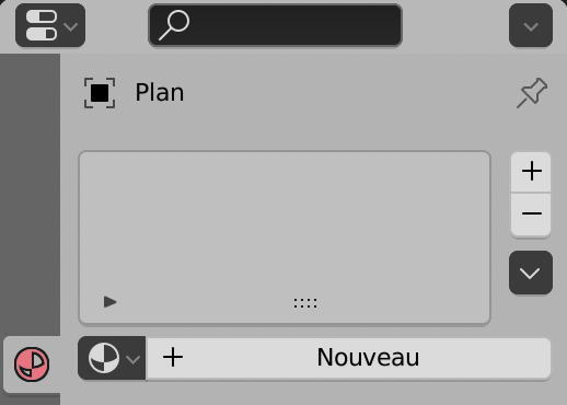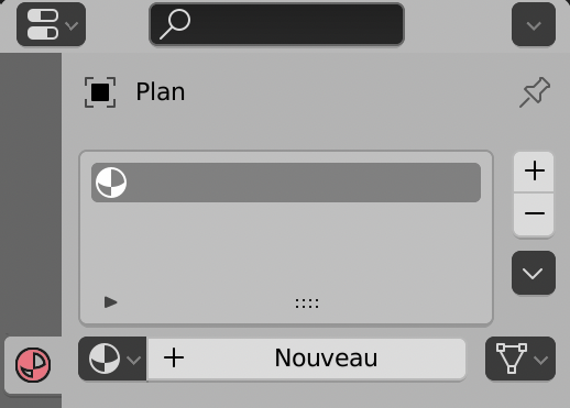 Sélectionner le Plan et dans les Propriétés, cliquer sur l’onglet Shader (voir l’icône du Cercle Rouge ci-dessous). Cliquer sur le bouton + en haut à droite pour créer un nouveau Shader. Cela rajoute une bande grise vide dans la liste des Shaders.