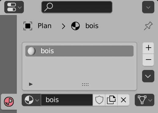 Double-cliquer sur le mot Matériau en bas, sur le bouton et changer le nom. Taper « bois ». Ce nouveau nom s’inscrit aux deux endroits.