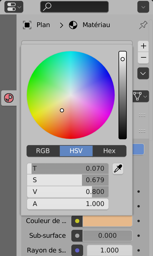 En haut des Propriétés le bouton « Utiliser Nœuds » (Nodes) est coché. C’est un système puissant pour régler l’aspect des matériaux.
