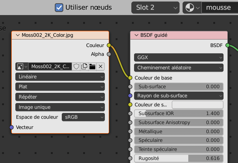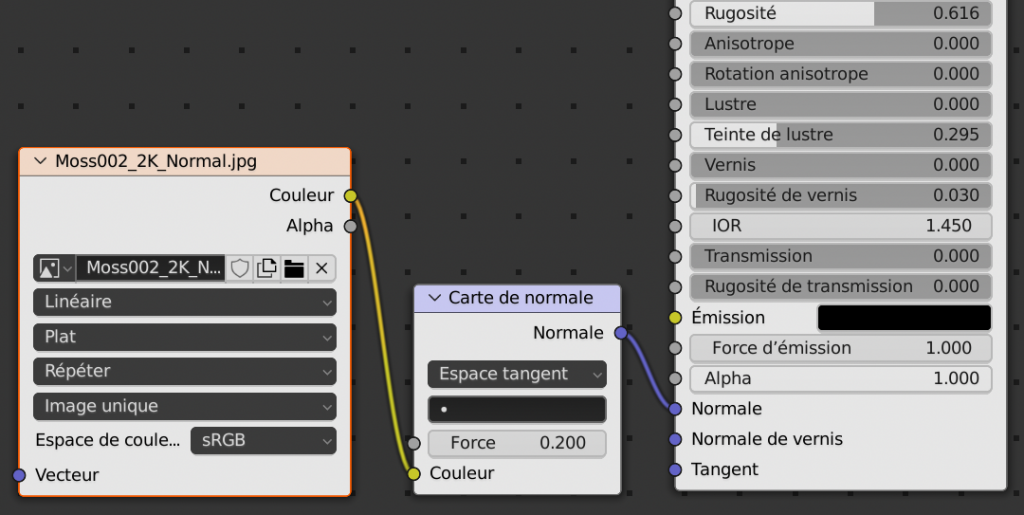 Faire de même pour l’image « Moss002_2K_Normal, à brancher sur le point bleu Normale.