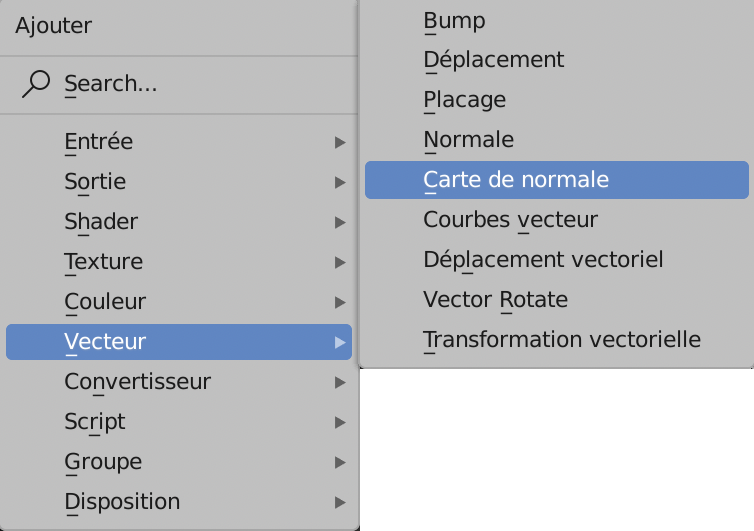 Ajouter un Node Vecteur > Carte de Normale pour moduler la force du relief et l’intercaler entre les deux précédents en les reliant comme ci-dessous.