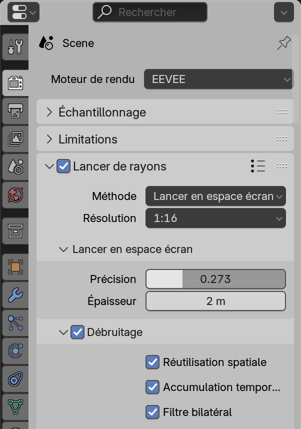 Ci-dessous à gauche, dans l’onglet Render des Propriétés, choisir le Render Engine Eevee, puis cocher la case Lancer de Rayons.