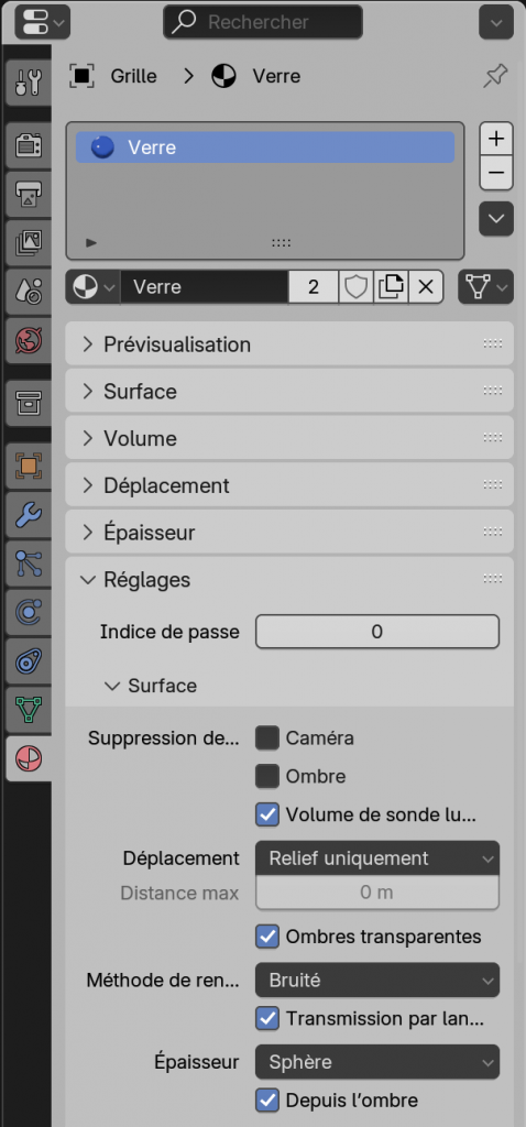 Le réglage pour Eevee concerne la réfraction. Il faut activer la réfraction pour le rendu Eevee ainsi que pour le matériau verre appliqué à un objet, mais ce réglage a été modifié depuis la version 4.2 de Blender.