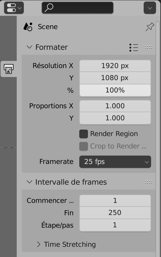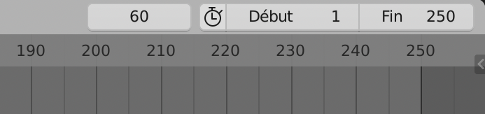 La durée totale de l’animation est de 250 images par défaut, soit 10 secondes à 25 ips. Modifier cette valeur si besoin, dans les Propriétés de Sortie, Réglage Intervalle de frames, ci-dessus ou en haut à droite de la TimeLine, ci-dessous.