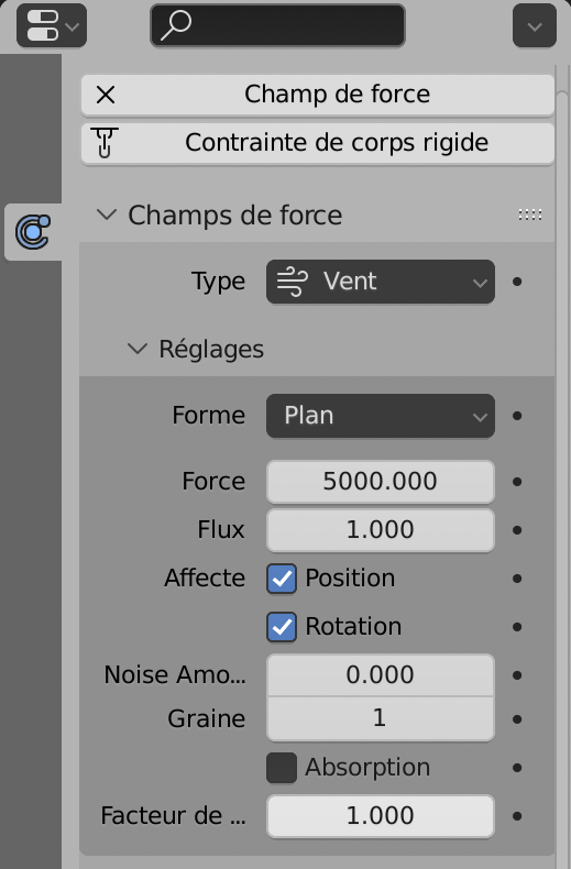 Dans les Propriétés Physiques, attribuer un comportement Tissu à ce Plan. Tester l’animation. Le drapeau tombe contre le mât. Nous allons rajouter un phénomène physique de Vent pour le faire flotter.