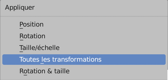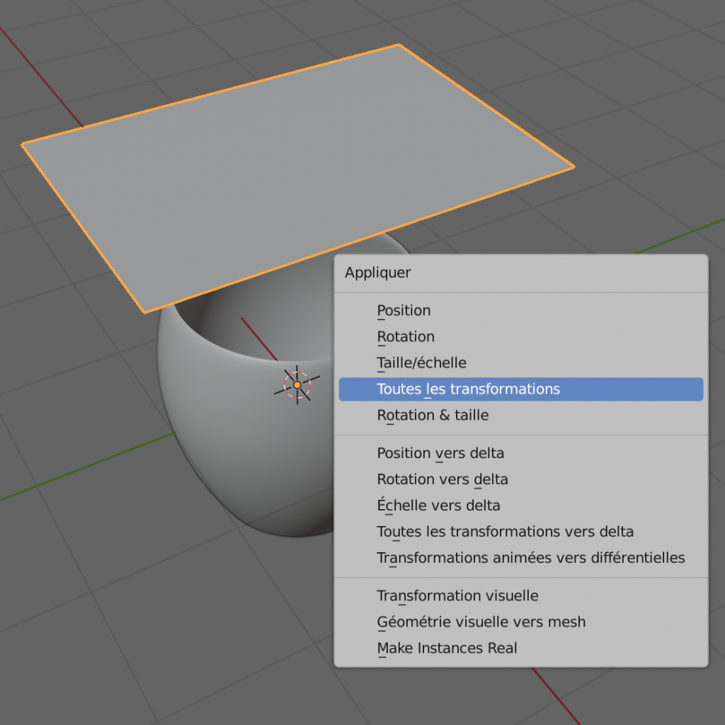 Il est ensuite recommandé de Réinitialiser les valeurs de mise à l’échelle. Il faut donc les Appliquer (Ctrl A) et choisir « Toutes les Transformations ».