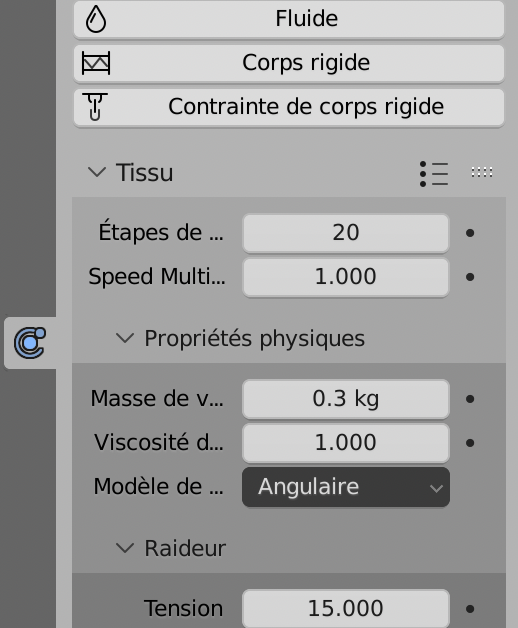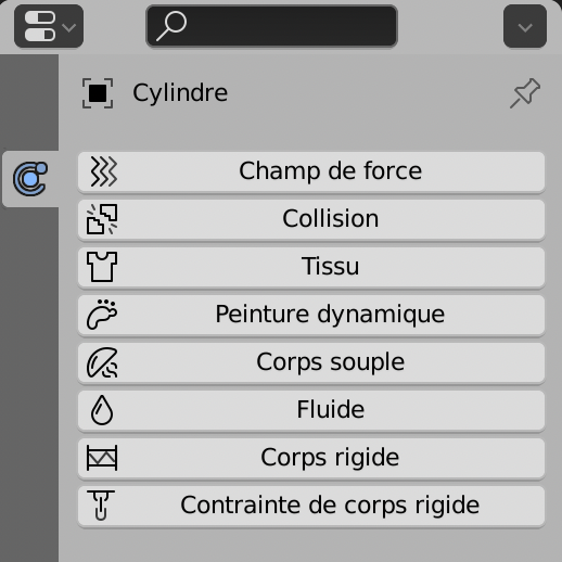 Cliquer sur l’onglet « Physique » des Propriétés. L’icône est un double cercle bleu.