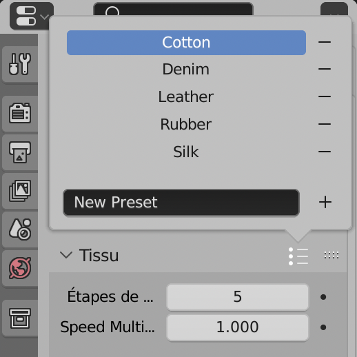 Le premier Réglage en haut comporte un Menu à droite pour choisir un préréglage de tissu. Prenons Cotton par exemple.