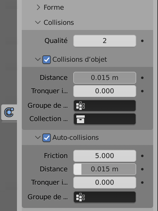 Dans le Réglage Collisions, il faut cocher les cases « Collisions d’objet » et « Auto-collisions » afin que les plis du tissu ne s’interpénètrent pas.