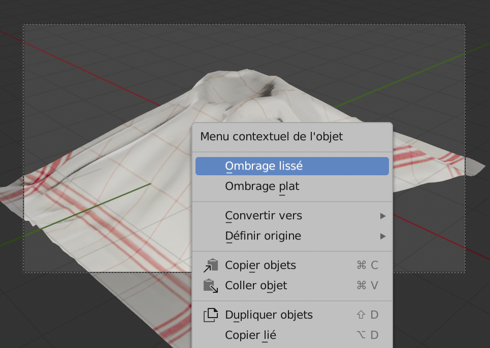 Le résultat peut être amélioré en activant l’ombrage Lissé pour le Tissu, en Mode Objet (Clic Droit) et en modifiant les paramètres d’étapes notamment pour réduire les effets de déchirement du Tissu.