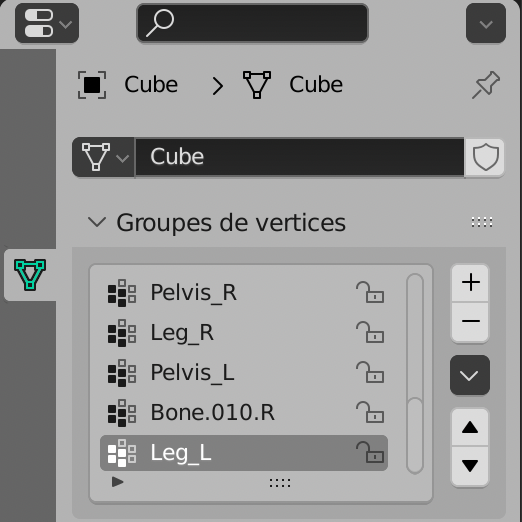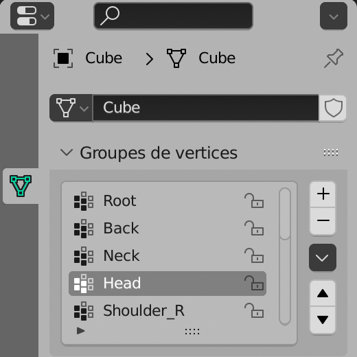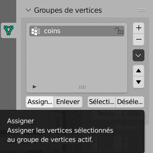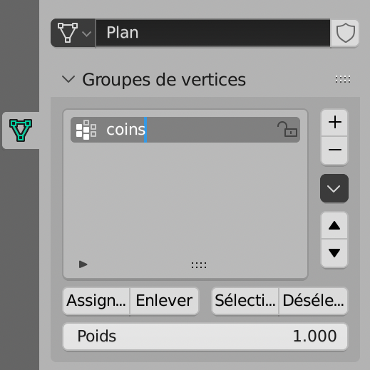 Il faut commencer par créer un groupe de Vertices. Dans les Propriétés, cliquer sur le Triangle Vert, l’onglet DATA. Ouvrir le Réglage Groupes de Vertices et cliquer sur le bouton Plus en haut à droite. Renommer le groupe « coins » par exemple.