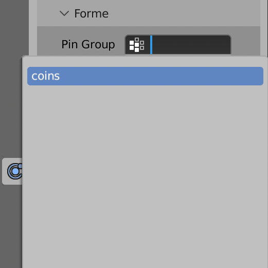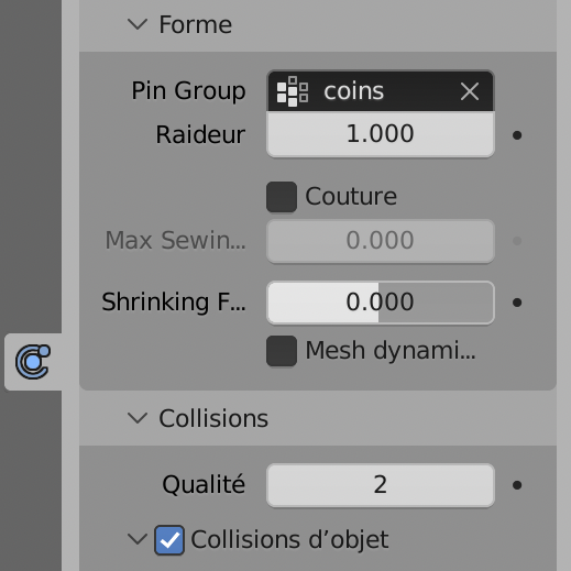 Revenir dans les Propriétés Physiques du Tissu. Dans le Réglage Forme cliquer sur la Zone Pin Group et choisir le groupe « coins ».