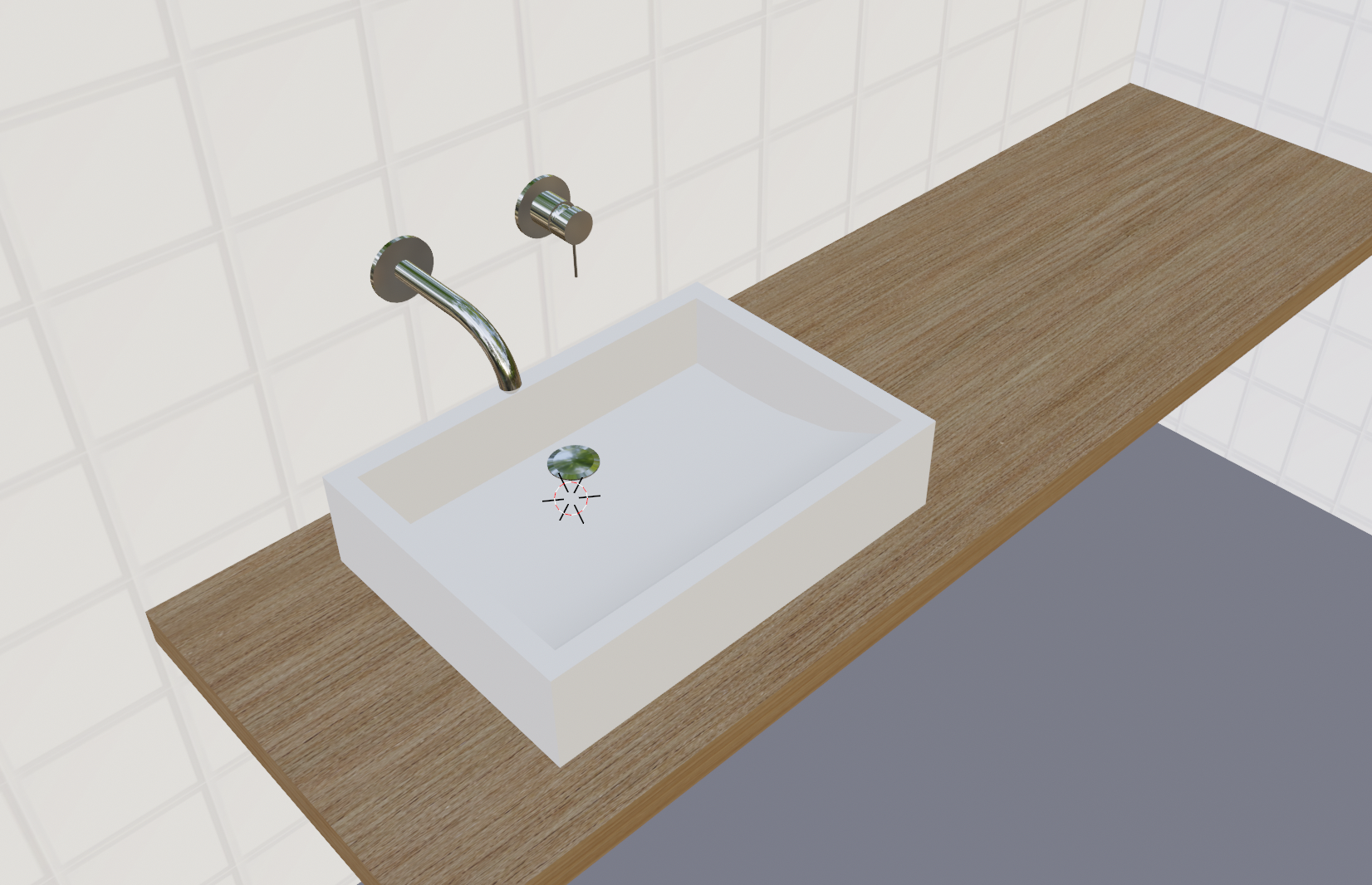 Ici, après modélisation, une Sphère à l’extrémité du robinet jouera le rôle de Flux, le lavabo servira de Collider et un grand Cube sera le Domaine (invisible ci-dessous, il doit contenir le robinet et le lavabo)