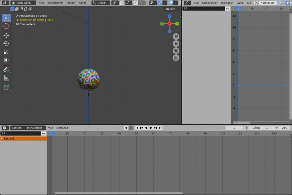 Modifier l’interface en tirant la TimeLine vers le haut et en rajoutant une fenêtre à droite de la Vue 3D (Clic Droit à droite de la Vue 3D et Division Verticale). Choisir l’Éditeur de Graphe dans cette fenêtre.