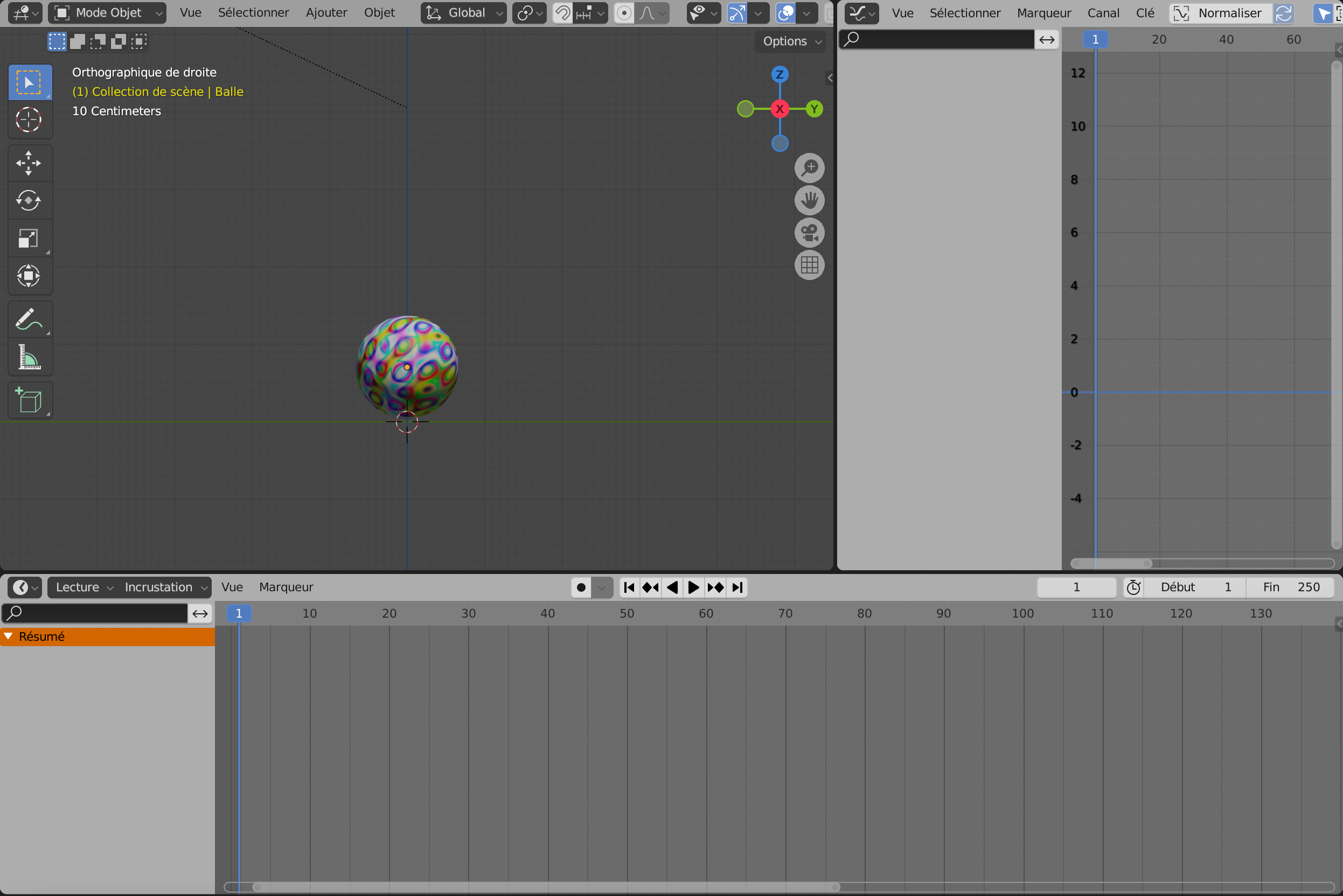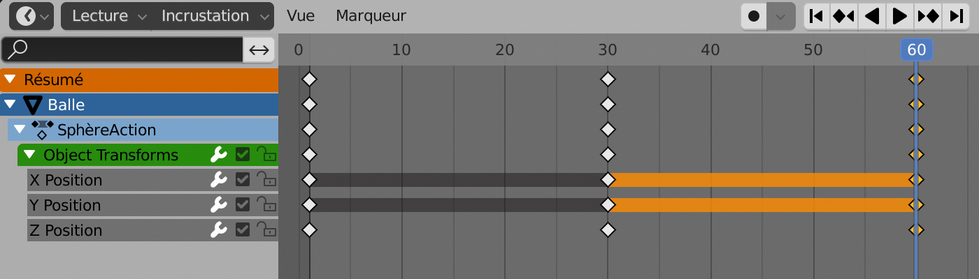 Dans la TimeLine Copier l’image clé initiale ( C), placer la tête de lecture à l’image 60 et coller l’image clé ( V). La balle à présent s’élève, puis redescend à sa place.
