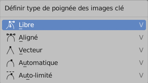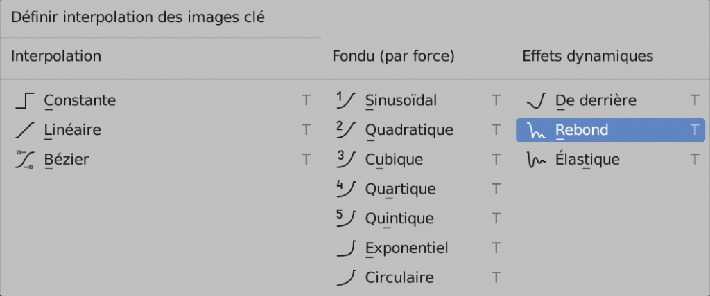 Nous venons de modifier la courbe manuellement en fonction des besoins, mais si besoin, la forme de la courbe peut être modifiée globalement. Sélectionner un segment par ses deux points limites. Taper T et choisir une forme dans le panneau qui s’affiche, voir ci-dessous. Rebond par exemple.
