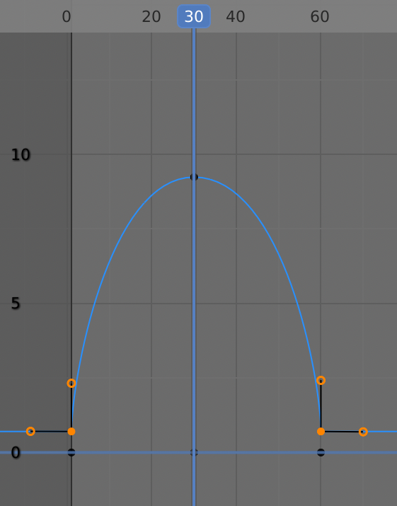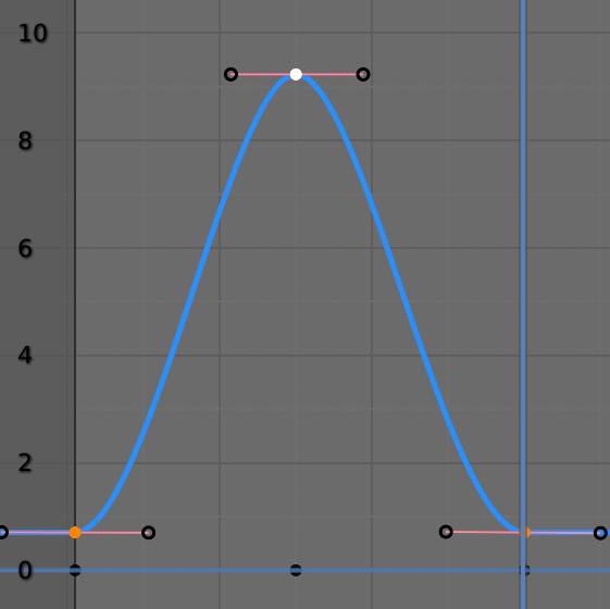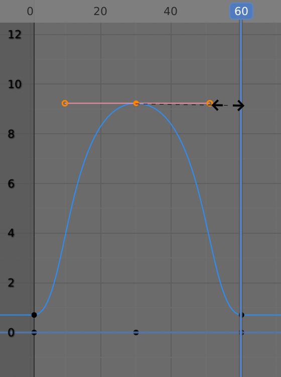 Il faut déplacer les tangentes comme ci-dessous à gauche. Puis, il peut être utile pour ralentir l’arrivée en position haute, d’allonger les tangentes de la clé intermédiaire. Sélectionner les poignées et mettre à l’échelle (S X), comme ci-dessous à droite.