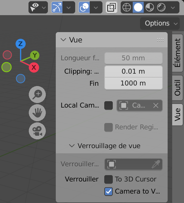 Afficher le Panneau Numérique dans la Vue 3D (N). Cliquer sur l’onglet Vue.
